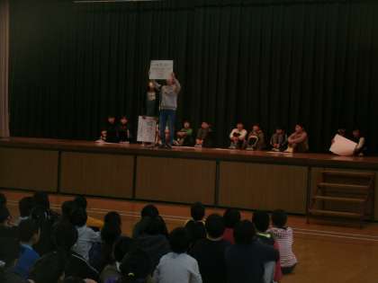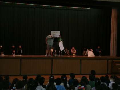 今日は図書委員会の発表です。金塚小学校の図書館にある本に関するクイズを出題してくれました。