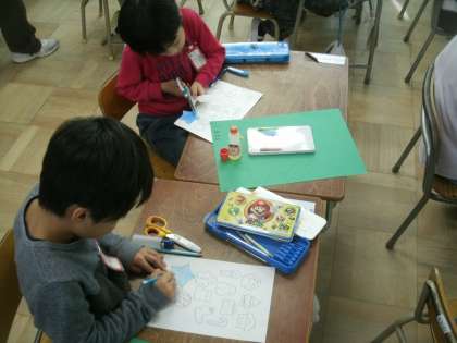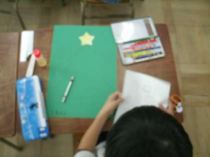 クリスマスツリーを作っていました。色鉛筆で色を塗ったり、ハサミで切ったり、のりで貼り付けたり・・・。子ども達は入学した頃とは比べられないほど上手になりました。本当に嬉しく思います。