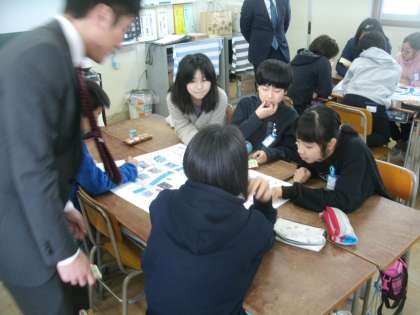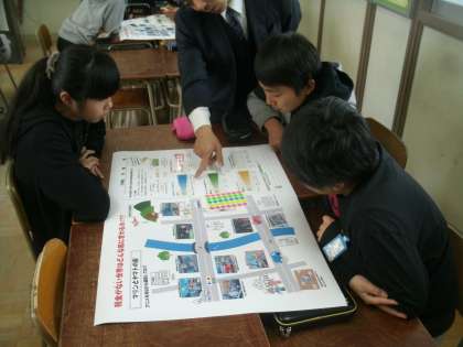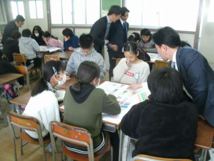 税務署や納税協会の方々にゲストティーチャーとして来ていただき、租税についての学習に取り組みました。グループごとに分かれて、大きなワークシートを使って「税金がない世界はどんな風に変わるの。」ということについて話し合いをしています。