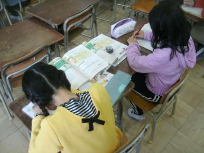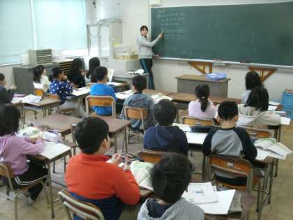 算数科学習の様子です。 問題「5人がけの長いすが30脚あります。全部で何人座れますか。」
