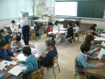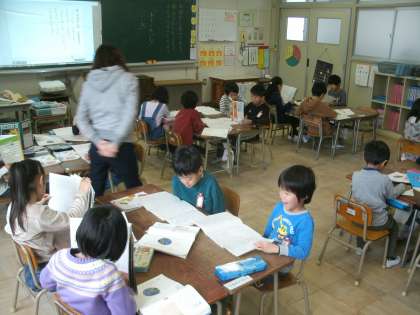 国語科学習の様子です。「おはなしをつくろう」という学習です。この時間は作ったお話をお互いに読みあって、感想を伝え合っています。