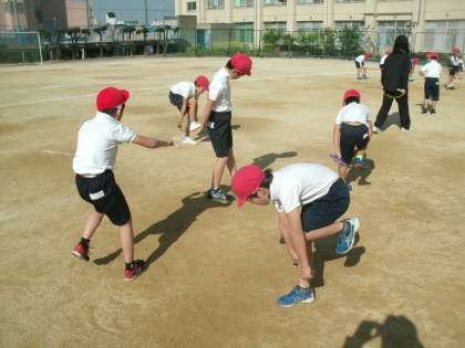 体育科学習の様子です。短なわを使って準備運動に取り組んでいます。子ども達はびっくりするほど肩の可動域が大きく、うらやましい限りです。