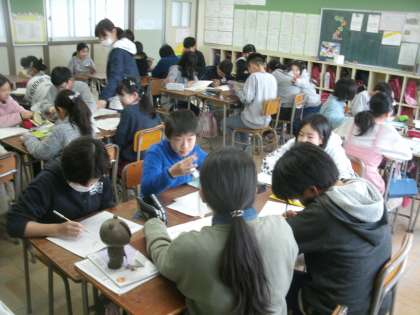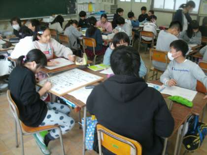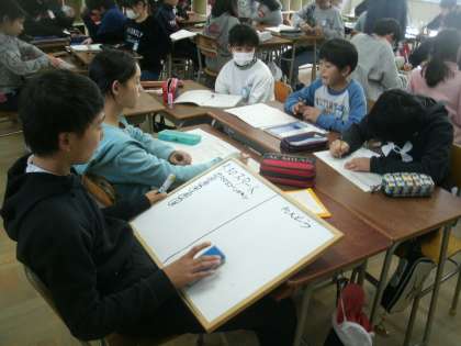 家庭科学習の様子です。「お世話になった方々に感謝の気持ちを表すパーティーをしよう。」という学習課題です。グループに分かれて企画立案の話し合い活動をしています。