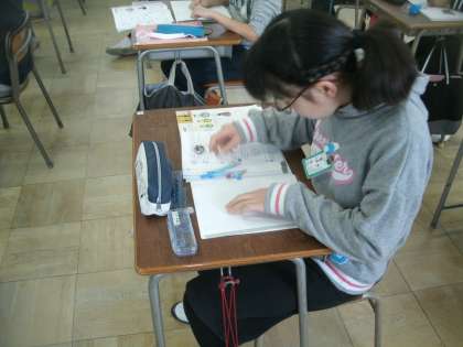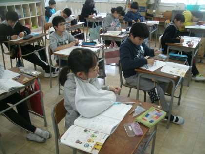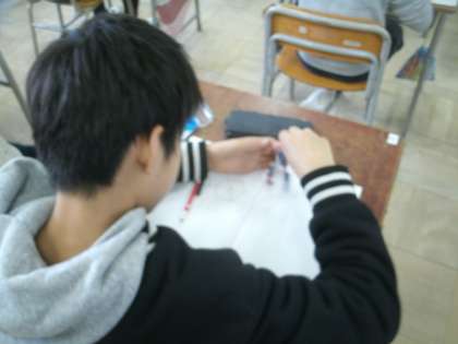 算数科学習の様子です。分度器を使わずに、コンパスと定規だけを使って正6角形を書いています。分度器を使わないで正6角形が書けるのはなぜかということを考えていきます。