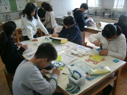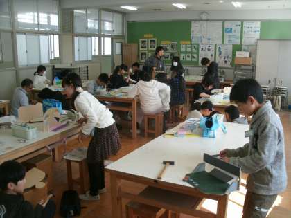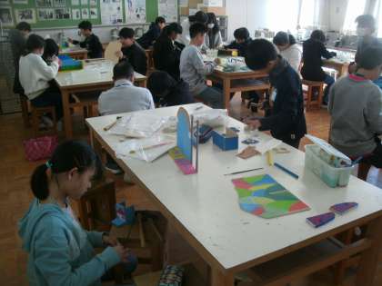図画工作科学習の様子です。「1枚の板から」という作品が完成に近づいています。