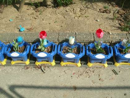 朝から元気いっぱいで登校してきてくれました。1年生が植えたチューリップも花を咲かせ始めました。
