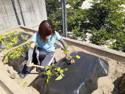 12日(火)の午後にサツマイモの苗(写真1)が届きました。本当なら2年生のみんなに植え付けてもらわなければいけないのですが、次の登校日は18日(月)。このままだと苗が弱ってしまうので、昨日、大急ぎで管理作業員の畠山さんに学習園を耕してもらいました。