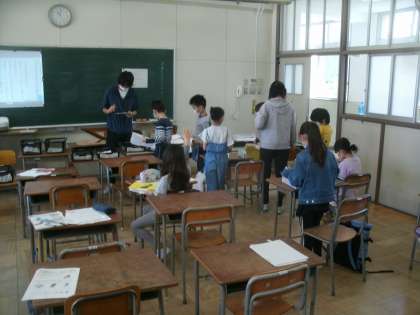 給食の配膳台を使って、その上にかごを置いて、提出プリントごとに集約しています。間違って違うかごに入れないように気をつけましょうね。