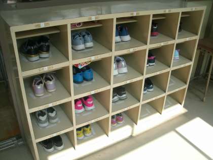 靴箱に白いビニルテープが貼ってありました。靴箱の靴が見事に揃えられています。