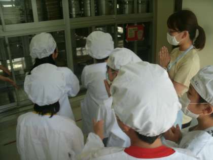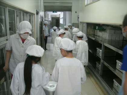 Aグループ・Bグループに分かれて、給食室まで取りに来ます。 「4年○グループです。いただきます。」