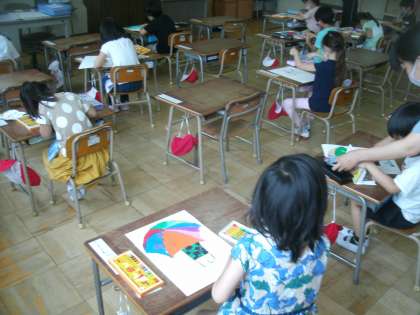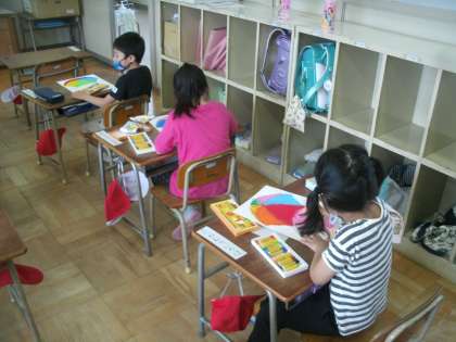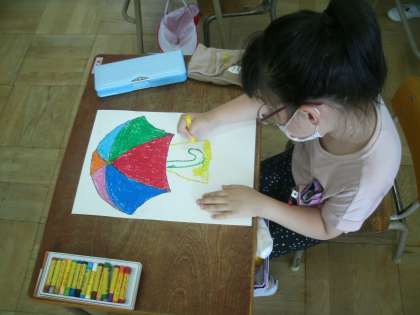 図画工作科の学習です。クレパスを使って、きれいな色の傘に仕上げていました。