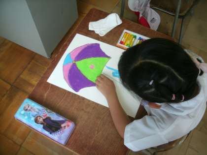 図画工作科学習の様子です。クレパスを使って、思い思いの色を塗っています。