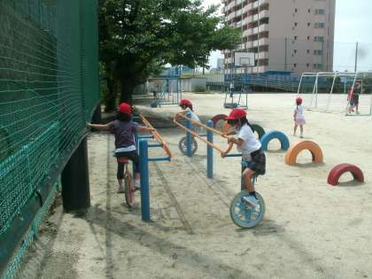5年生と3年生がドッジボールで楽しんでいました。低学年には第2運動場の遊具と1輪車が人気です。