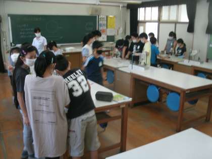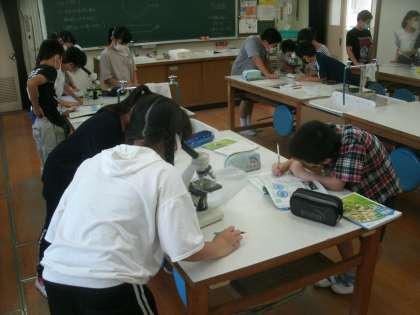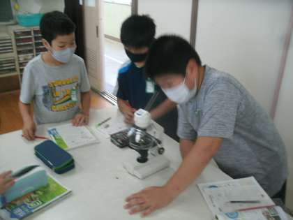 理科室でがくしゅうしています。今日は顕微鏡を使って、メダカの卵を観察していました。卵の中で大きな目のメダカの心臓から血液が流れている様子までしっかり観察し、記録することができました。