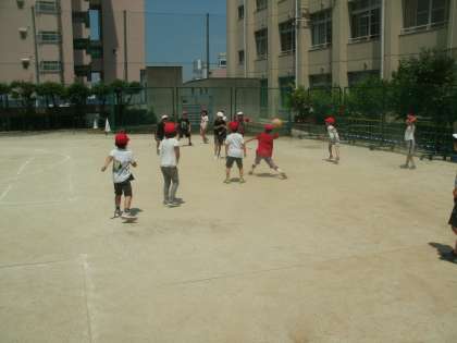 子ども達は強い日差しに負けないで、運動場に飛び出してきて元気いっぱいで遊んでいます。教室に入る前にはしっかり手洗いをして、水分補給も忘れずに。