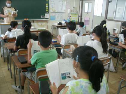 国語科学習の様子です。「動物たちが教えてくれる海の中のくらし」という教材文をリレー読みしています。間違えるとやり直しになるので全員が真剣そのものです。