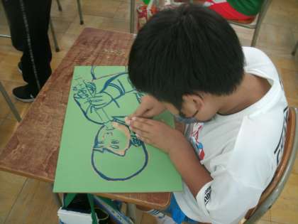 4階に上がっても、6年1組は特別教室に行って、教室にはいないのかと思ったほどでした。誰一人おしゃべりをすることなく、集中して彫刻刀で版画板を彫っていました。私が教室に入っていっても、版画板を彫るカリカリという音しか聞こえません。素晴らしいですね。当然、けがをする子どもはいませんでした。当然ですよね。あれだけ集中していれば大丈夫です。「金塚のスタンダード」6年生の頑張りに拍手を送りたいです。