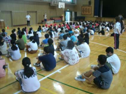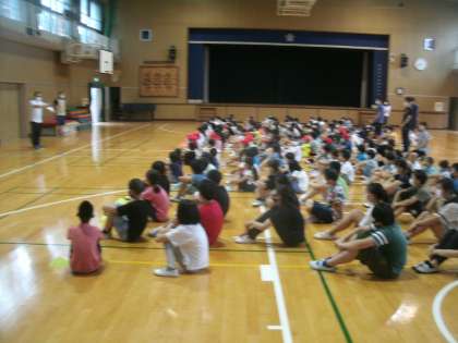 月曜日は児童朝会があります。今日は強い雨が降っていたので、体育館で行いました。