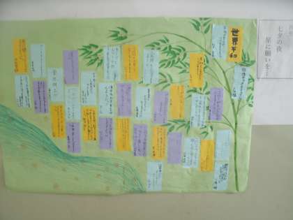 「七夕」 4年生 公開日 2020/07/07 更新日 2020/07/07 お知らせ 4年生の短冊にはこんなことが書かれていました。 「学力向上」 「コロナウイルス感染症が終息しますように」 「忘れ物をしなくなるように」 「スイッチがほしい」等々 さすがに4年生になると、1年生とは中身が少し違ってきますね。 いいね(0)