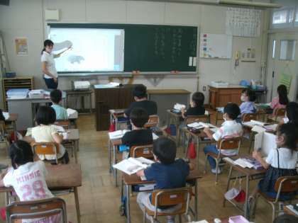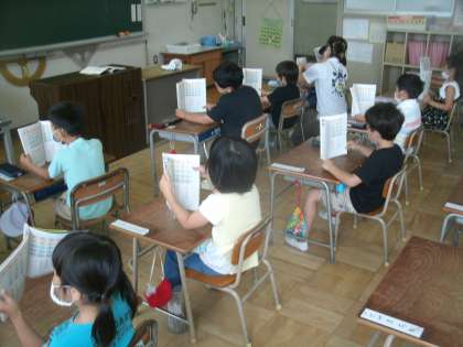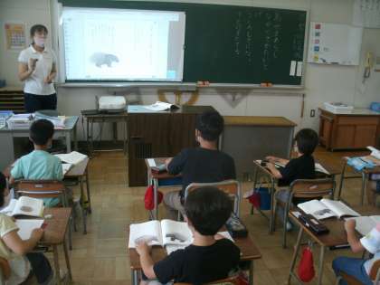 国語科学習の様子です。全員で音読しています。金塚小学校は音読をするときは1年生から6年生まで原則的に両手で本を持つことになっています。
