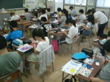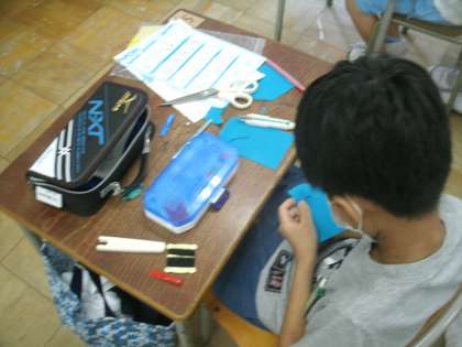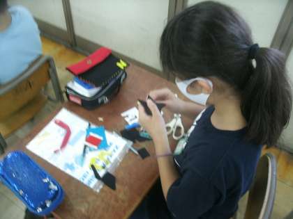 家庭科学習の様子です。今日はフェルトを使って、「小物作り」の学習です。子ども達はペンケースやコインケースを作っています。フェルトを上手に切って、自分のイニシアルをつけている子どももいました。