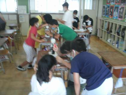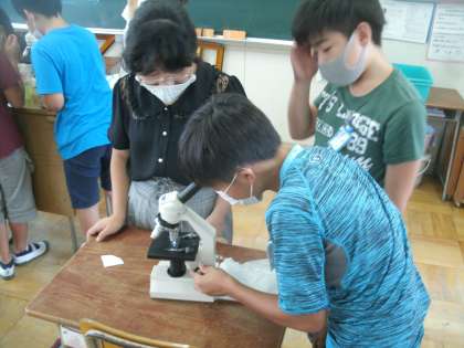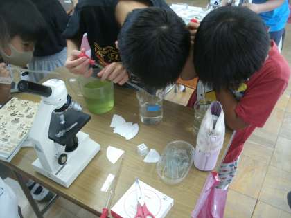 理科学習の様子です。顕微鏡を使って、採取したプランクトンを観察しています。