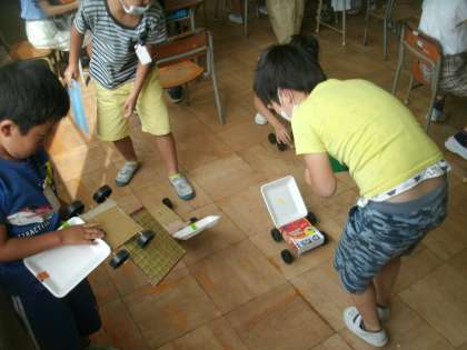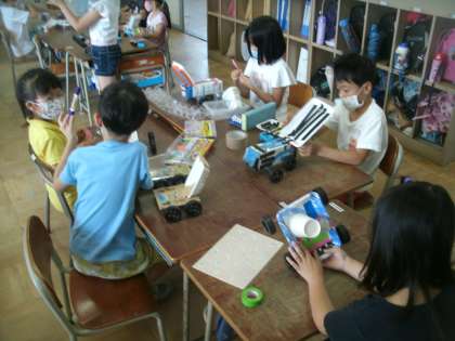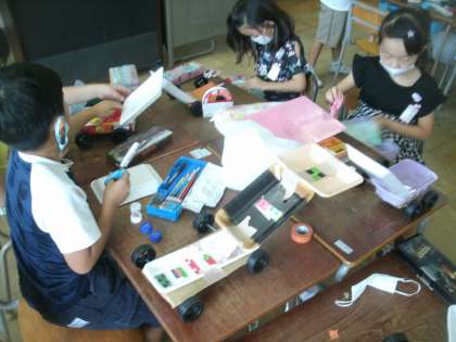 生活科学習の様子です。今日は「ヨットカー」を作っています。個性豊かなヨットカーが出来上がりました。