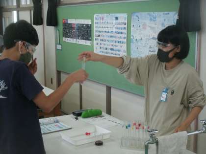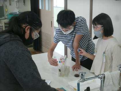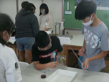 理科学習の様子です。理科室で「水溶液の性質」についての実験をしています。