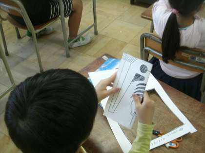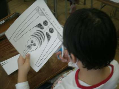 図画工作科学習の様子です。今日は「ほねほねおばけを作ろう」です。みんなハサミを上手に使えるようになりましたね。