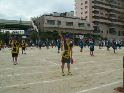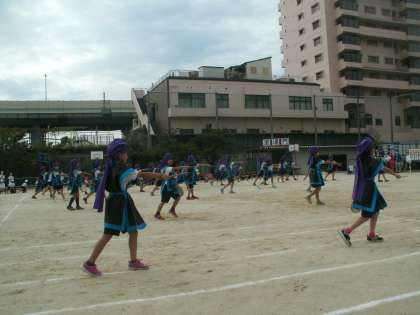 3・4年生の団体演技「金塚エイサー祭り」の様子です。パーランクーを叩きながら、リズミカルに、そして力強く踊ることができました。