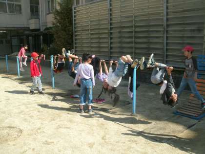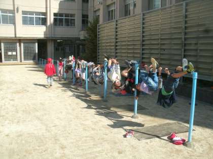 さて、今日も休み時間いつものように運動場に出ていました。何気に鉄棒付近に目を向けると不思議な光景が・・・。