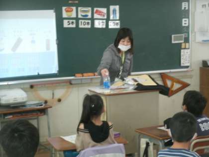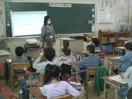テーマは「おやつについて考えよう」です。子ども達は日頃、飲む機会の多い清涼飲料水に思っている以上に糖分が含まれていることに驚いていました。スポーツ飲料500mlにはスティックシュガー10本分、コーラには17本分の糖分が含まれているそうです。糖分が悪いわけではありませんが、摂取過多は良くないですね。