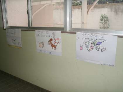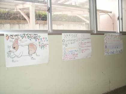 東校舎1階、会議室前に飼育栽培委員会の子どもたちが作成した「うさぎクイズ」が掲示されています。「Q.なぜしっぽは丸いの?」「Q.鳴き声はどんな声?」「Q.うさぎはなぜ目が赤いの?」等の問題がありました。皆さんはすべて答えられますか?