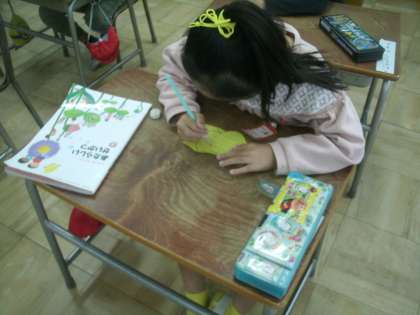 昨日、2年生に「おもちゃランド」へ招待してもらった1年生。楽しい時間を過ごさせてもらった2年生にお礼のカードを書いていました。