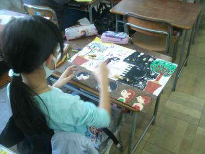 図画工作科学習の様子です。今日は水彩絵の具を使って「忘れられない あの気持ち」というテーマで図画を描いています。