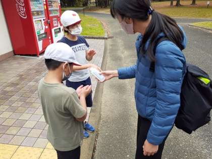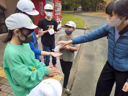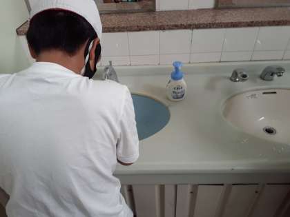 これからお昼ごはんです。 お弁当の前に手を洗ってから、消毒します。