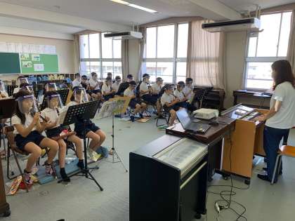職員室にリコーダーの美しい音色が響いてきたので音楽室をのぞいてみました。すると、5年生が「アラジンのフォールニューワールド」を練習していました。