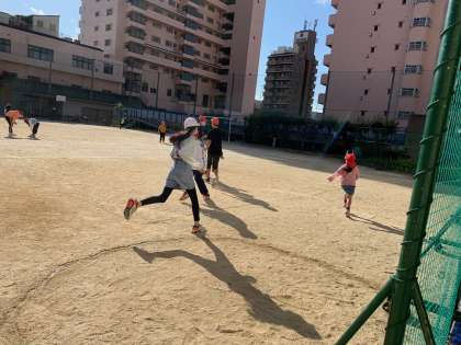 今日もいい天気です。夏日になりました。昼休みに6年生と1年生がけいどろで遊んでいます。