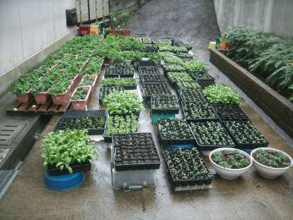 パンジー・ビオラ・キンセンカ・サクラソウ・ノースポール等、たくさんの苗がバックヤードで出番を待っています。