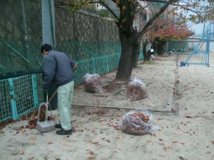 少し前まできれいに紅葉していた桜。朝晩の冷え込みが強くなってきたと思ったら、葉を落とし始めました。落葉樹は紅葉がきれいなのですが、それが終わると落葉が始まります。これが大変です。森林であればそのままにしておけばいいのですが、校庭や公園の落ち葉はそういうわけにいかず、集めていくことになります。管理作業員さんが大きな袋に集めてくださいました。私の子どもの頃はこれだけ落ち葉があれば焼き芋を焼いたりしたのですが・・・。これも、今は街中ではできなくなってしまいました。