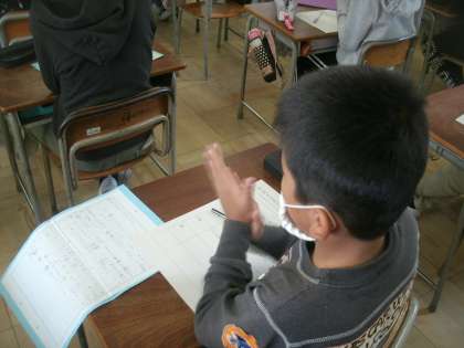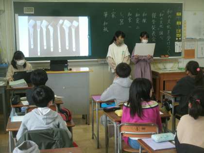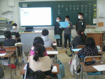 国語科学習の様子です。「和の文化を受けつぐ」という単元の学習です。グループに分かれて、「和の文化」についてプレゼンテーションをしています。