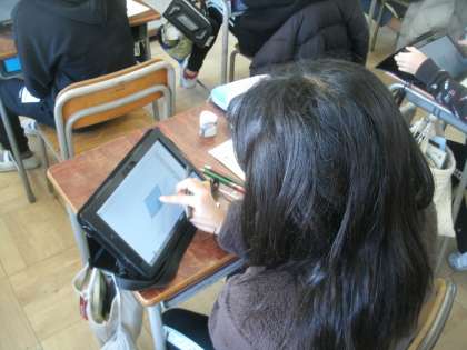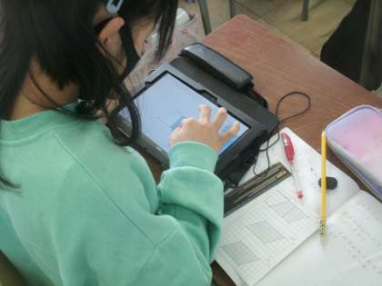 算数科学習の様子です。今日はタブレットを活用して平行四辺形の面積の求め方を導き出していきます。