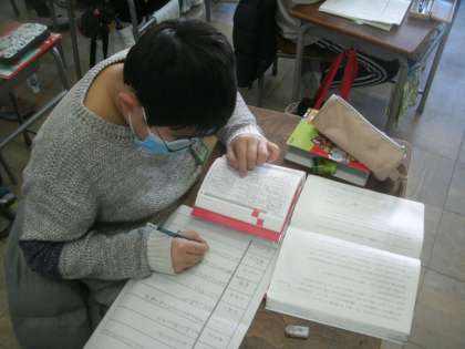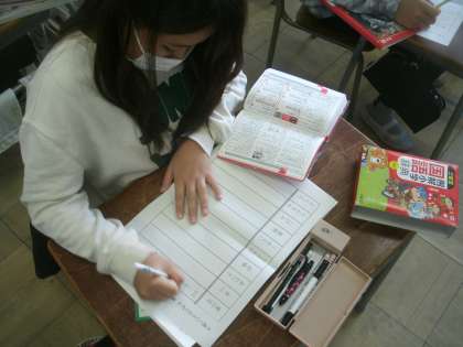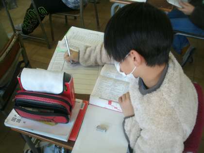 国語科学習の様子です。名作「大造じいさんとガン」の学習に入りました。今日は国語辞典を使って、難しい言葉の意味調べをしています。
