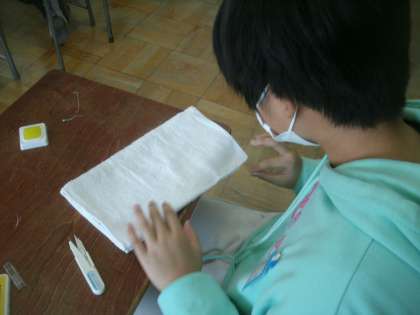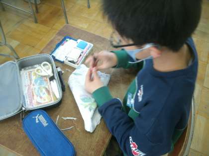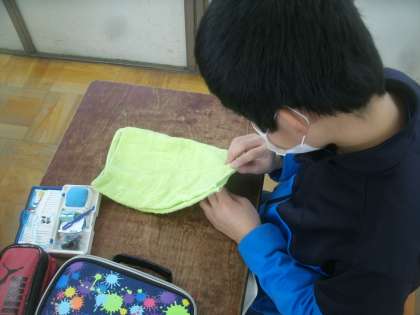 雑巾を縫っていました。今年度も卒業する前に学校へプレゼントしてくれるのでしょうか。