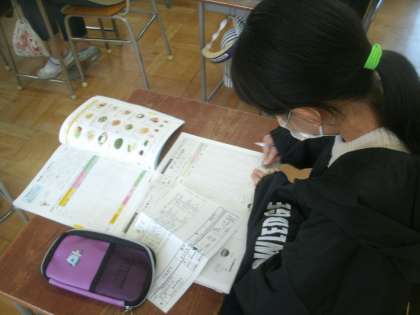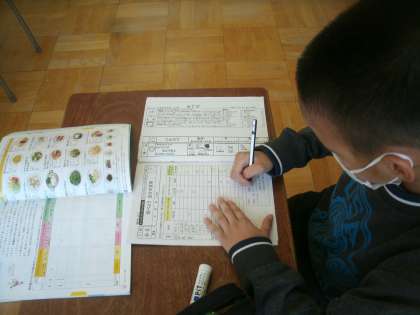 家庭科学習の様子です。「調べよう。自分の食事」という学習に取り組んでいます。栄養バランスの良い食事が摂れているかな。