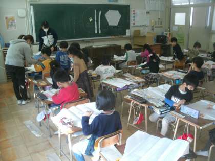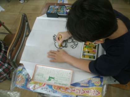 生活科学習の様子です。今日は「ぐにゃぐにゃだこ」を作っています。思い思いに絵を描いています。年が明けると、金塚小学校の空に子ども達の作った「ぐにゃぐにゃだこ」が揚がります。