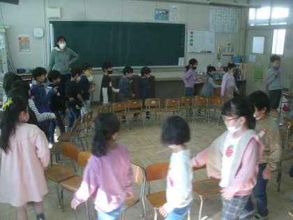 「椅子取りゲーム」で楽しんでいました。音楽に合わせて、楽しそうに椅子の周りを歩いている子ども達の姿を見るだけでも癒されますよ。保護者の皆さんにも見ていただきたかったです。