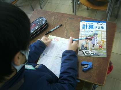 3学期の「計算ドリル」を配布しました。ドリルに書いてある通り、「くりかえし」取り組むことが大切ですね。