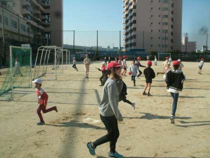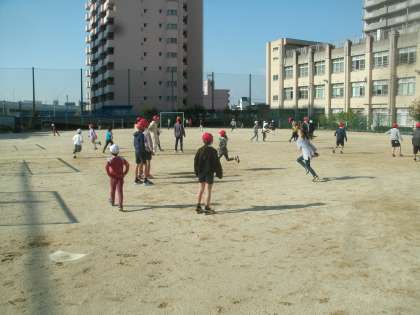 15分休みに「大阪市小学校学力経年調査」の準備で運動場に出て遊べなかった中・高学年の子ども達。元気に運動場で遊んでいます。