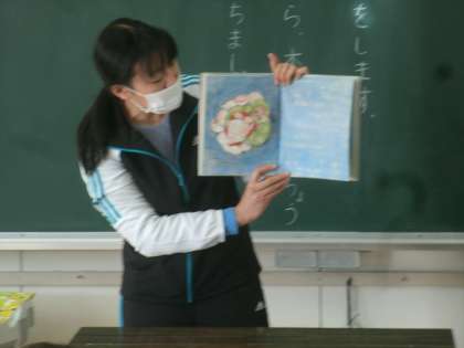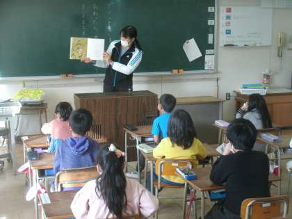 「読み聞かせ」をしている様子です。本来なら前の方に集まって読み聞かせをするのですが、コロナウイルス感染症感染予防対策のため、自分の席で聞いています。今日のお話は「かもとりごんべえ」です。